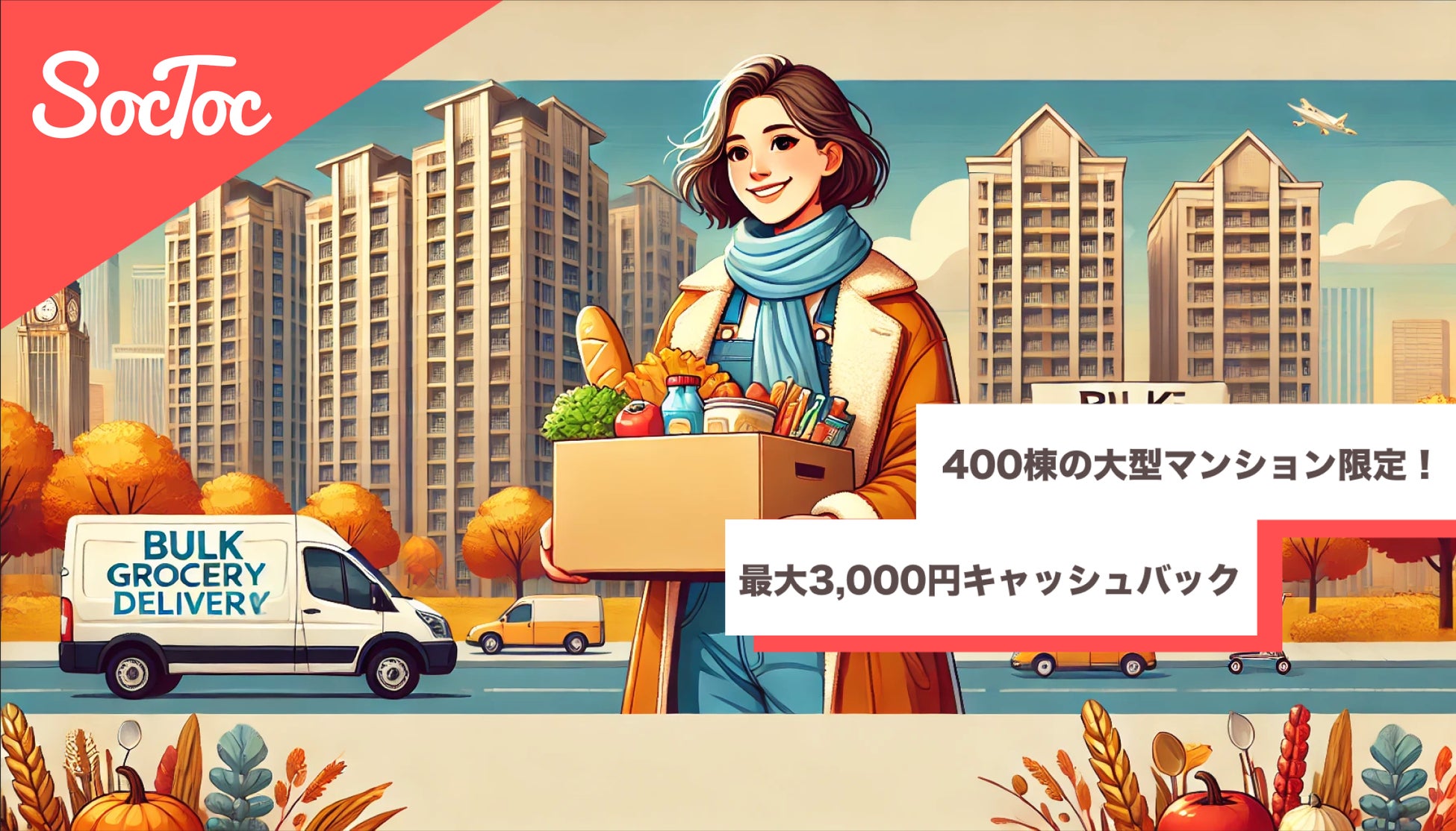今回、既にSocTocをご利用頂いたお客様がお住まいで配送実績のある都内400棟の大型マンションを対象に新規入会キャッシュバックキャンペーンを開催いたします。