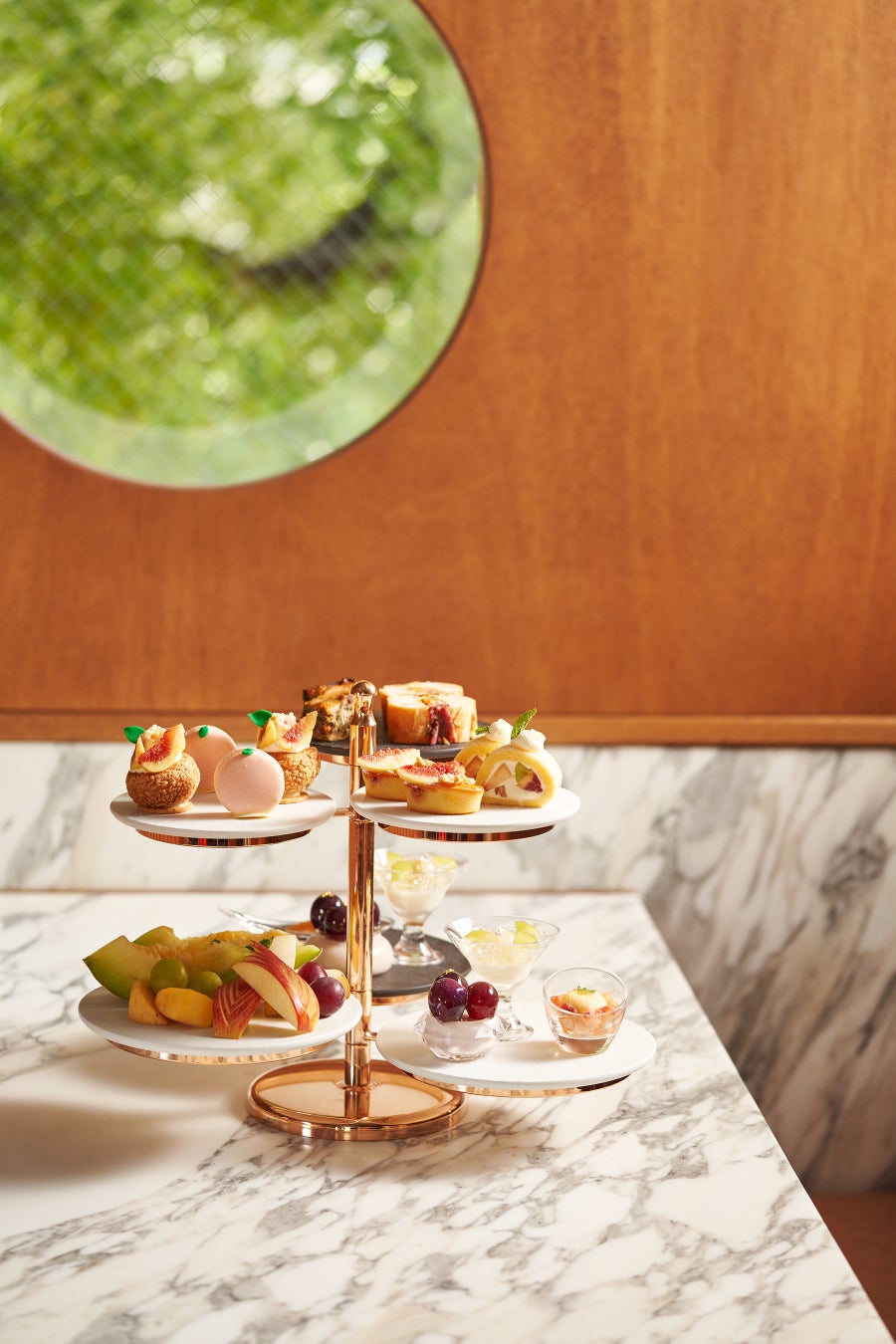 また、本当に美味しい旬の国産フルーツそのものの魅力を味わっていただくため、適熟でもっとも美味しい瞬間のフレッシュフルーツの盛り合わせもご用意いたしました。色とりどりの旬のフルーツが、ピンクゴールドに輝くスタイリッシュなスタンドを、みずみずしく、そして華やかに彩ります。