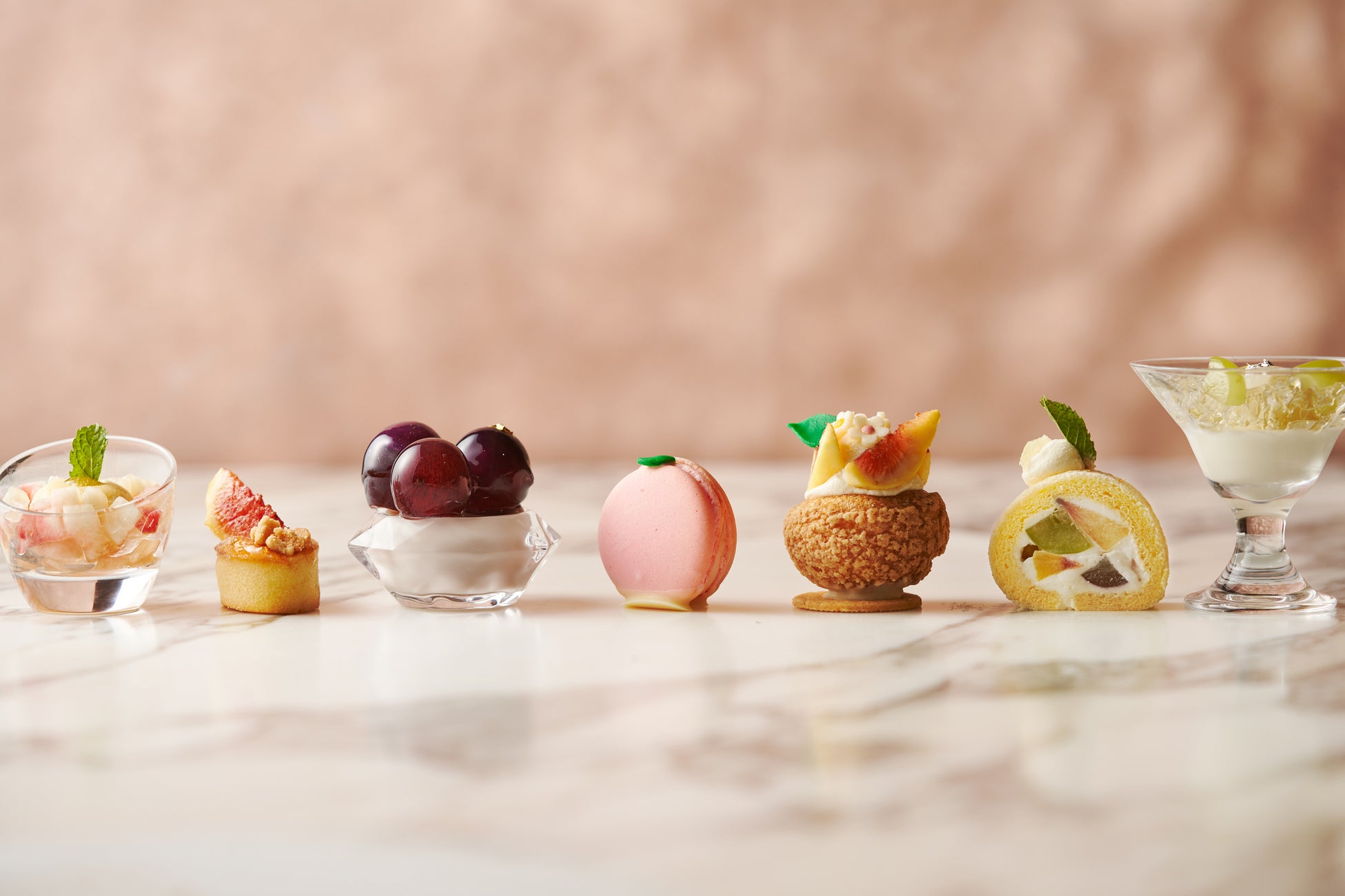 (メニュー例) 桃のコンポートにチーズケーキを添えて / 無花果のクランブルケーキ /赤ワインのブリュレと巨峰のフルーツ飴 / 桃のマカロン / 無花果のフラワーポット /季節のフルーツのレモンロール / シャインマスカットとシャンパンジュレ