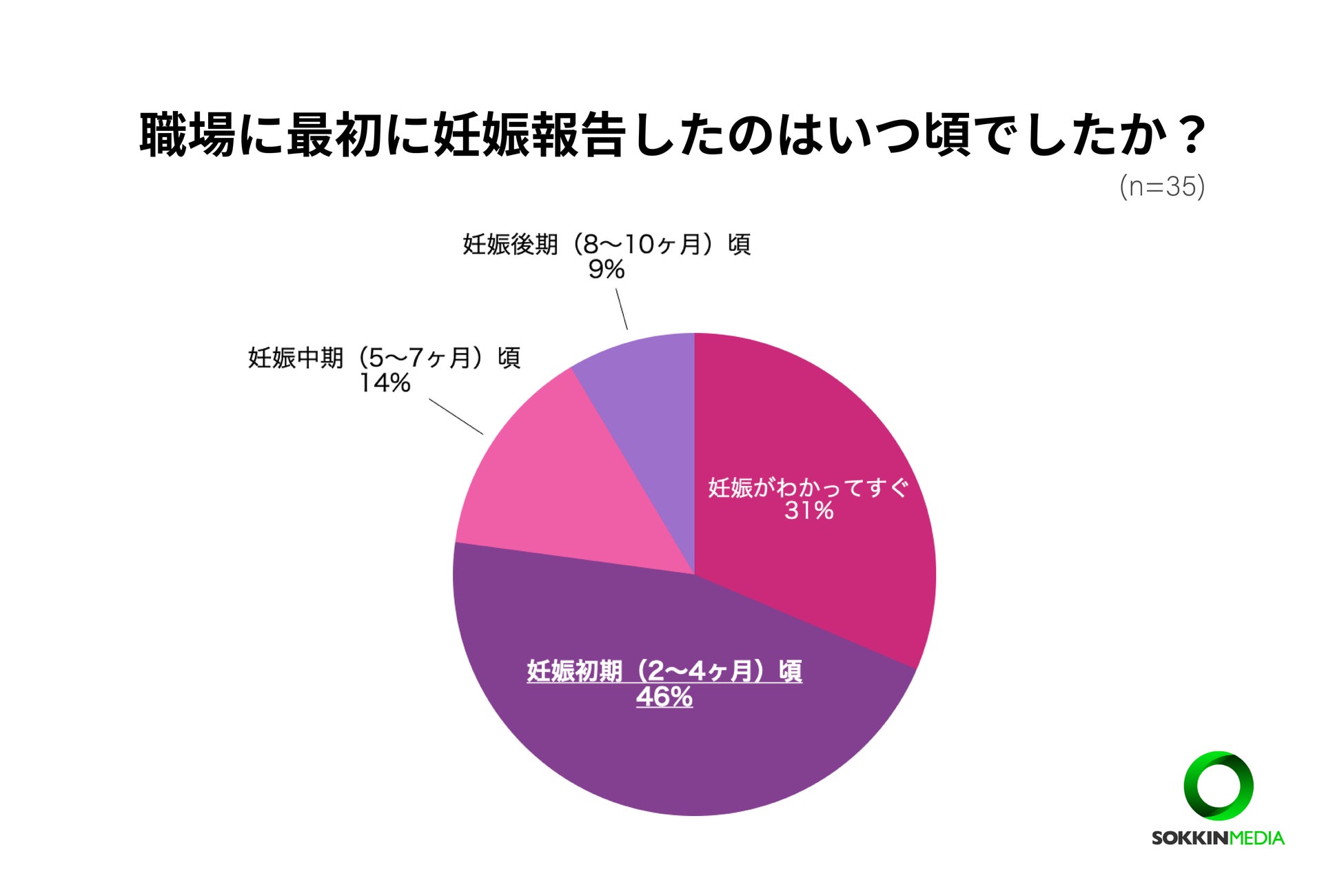 職場に最初に妊娠報告をしたのはいつ頃でしたか?という問いに対して、「妊娠初期(2~4ヶ月)頃」が最も多く挙がり、約半数を占めました。次いで「妊娠がわかってすぐ」が31%と、比較的早めに職場に妊娠報告した人が多いことがわかります。
