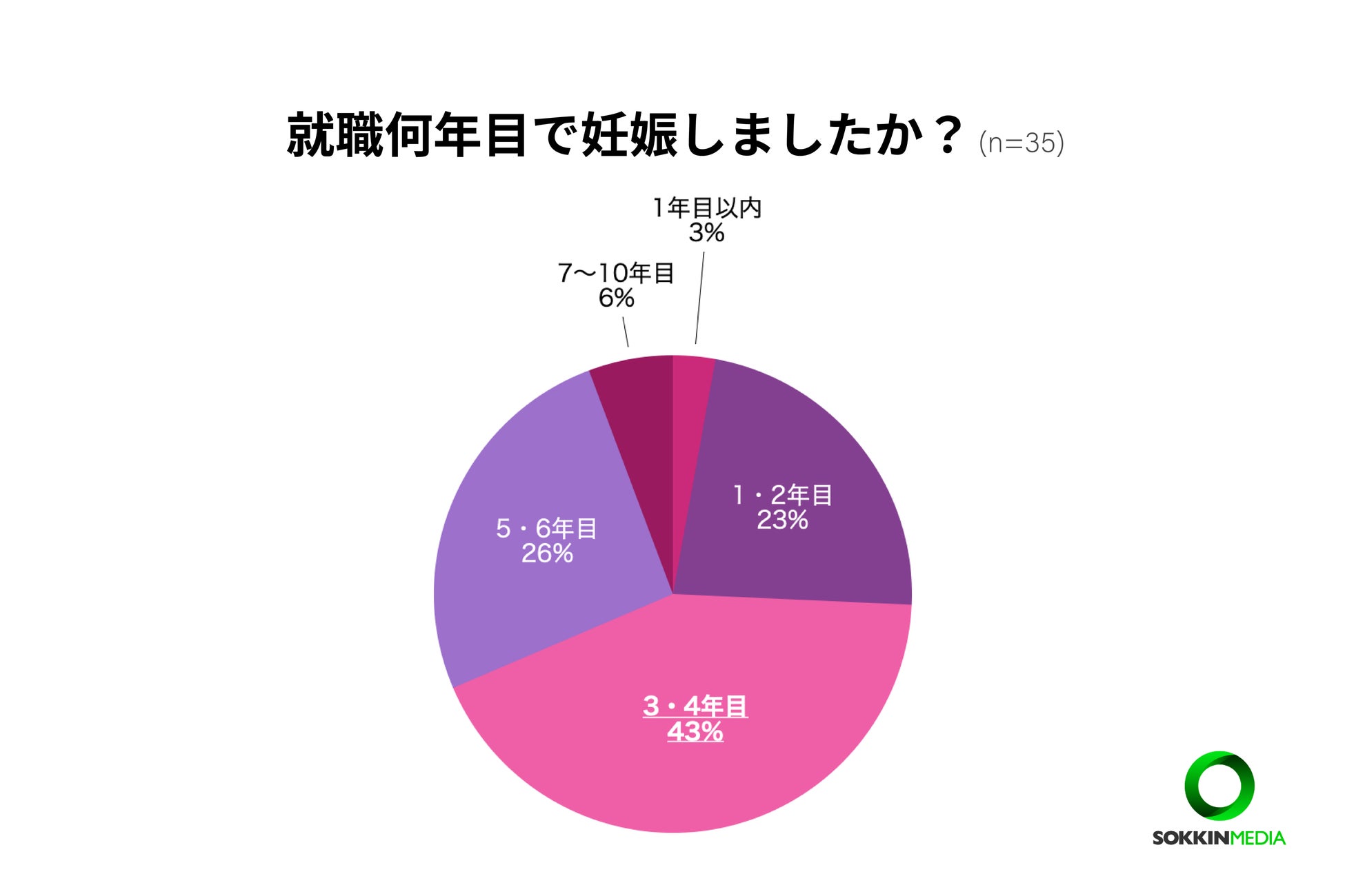 就職何年目で妊娠しましたか?という問いに対して、「就職してから3・4年目」という人が最も多く約4割に上りました。次いで「5・6年目」26%となっています。