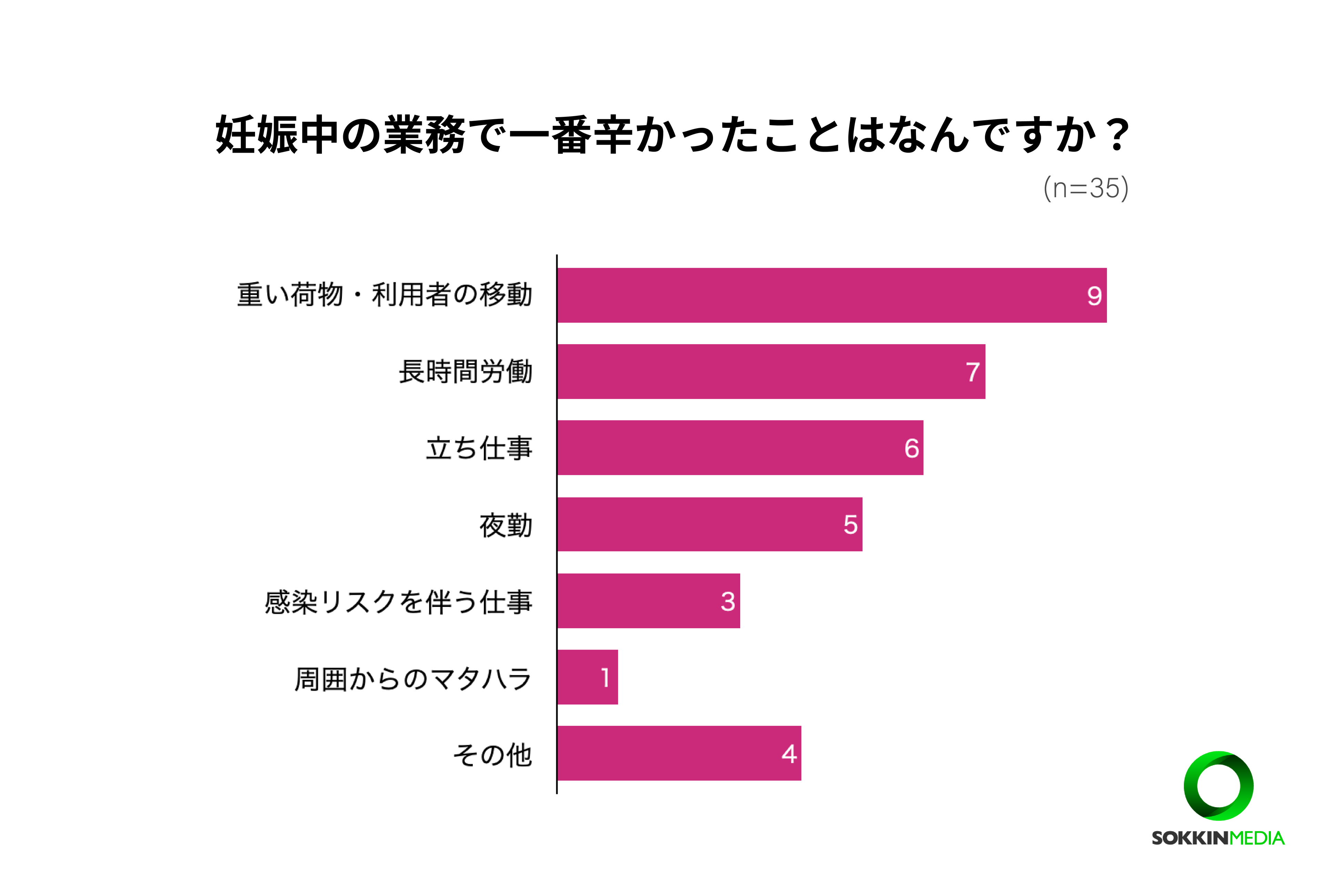 妊娠中の業務で一番辛かったことはなんですか?という問いに対しては、「重い荷物の移動・利用者の移動」9票(26%)が最も多く挙がりました。利用者の体位変換などを頻繁に行う介護士ならではの結果となりました。次いで、「長時間労働」7票(20%)、「立ち仕事」6票(17%)となりました。