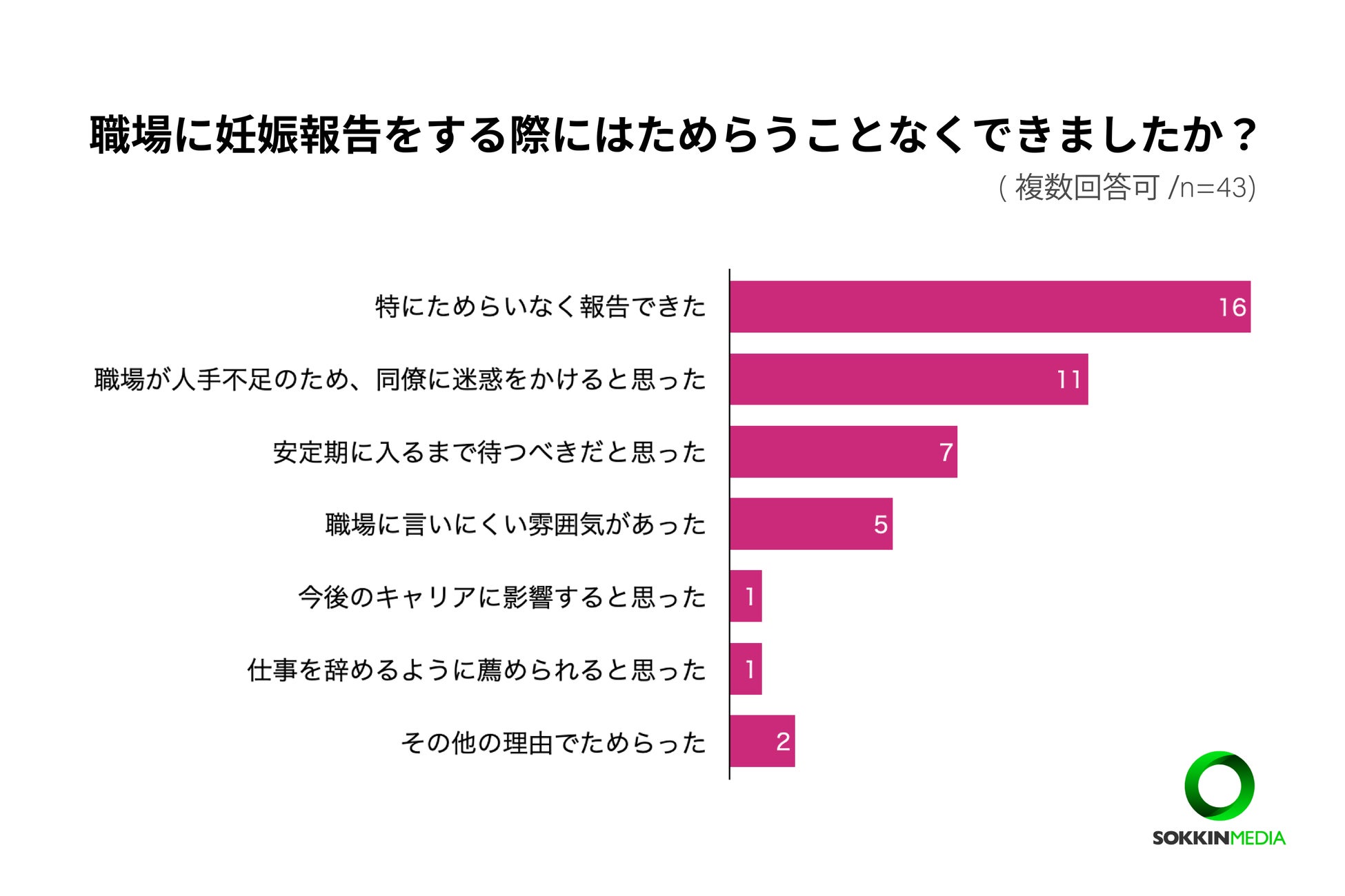 職場に妊娠報告をする際にはためらうことなくできましたか?(複数選択可)という問いに対して「特にためらいなく報告できた」と回答した人は全体の46%(16票)にとどまりました。