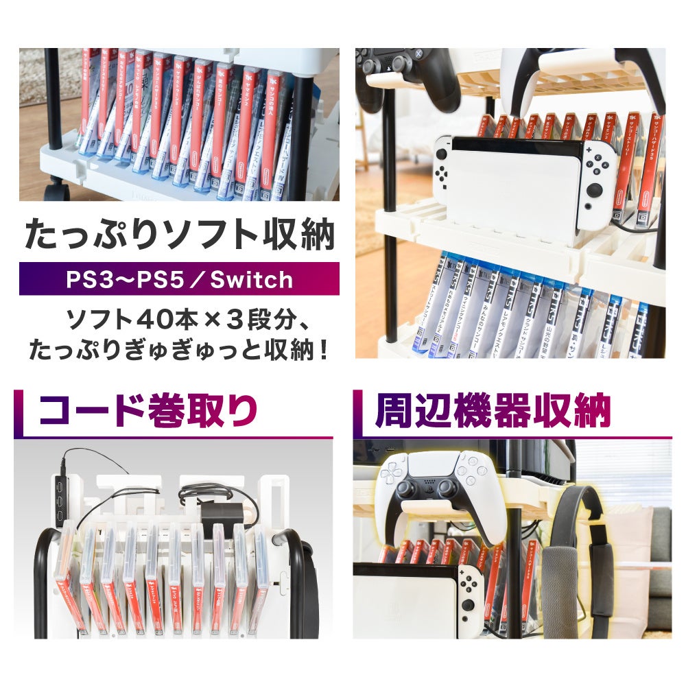 本製品はHDMI切替器と電源タップを搭載し、PlayStation 5やNintendo Switchなどのゲーム機やゲームソフトなどを置いて切り替えて楽しむことができるゲーミングラックです。