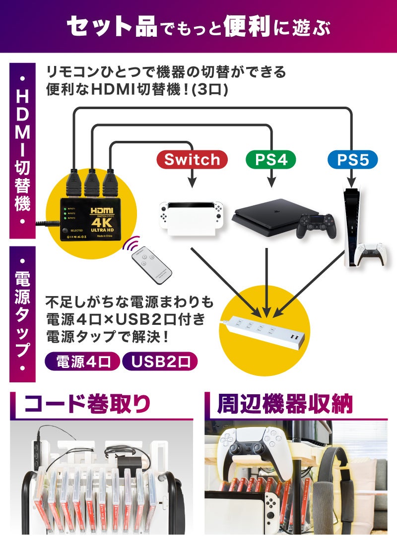 サイズは幅398×高さ690×奥行437mm、3段ラックで好きな場所にゲーム機を配置可能。HDMI入力をボタン一つで切替えられるHDMI切替器と2USBポート付3口の電源タップが付属。それぞれラック部分の1段目2段目3段目にHDMI切替器と電源タップを固定する場所があり使いやすい位置にセットが可能。HDMI切替器は4K(3840*2160)@30HZに対応し、切り替えは本体のボタン及び付属のリモコンで好きな場所で簡単に切り替えられます。ケーブルをまとめられるケーブルループ、コントローラーなどをひっかけられる6個のフックを搭載。キャスター付で簡単に移動できます。