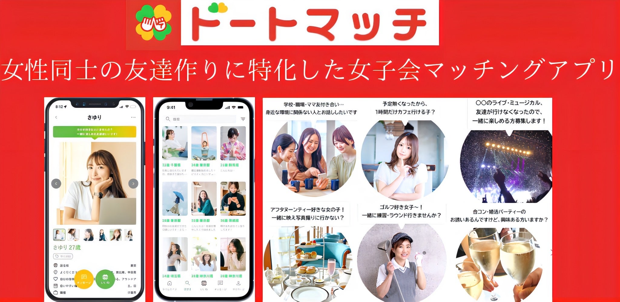 『ドートマッチ』は、従来の「マッチングアプリ=異性と恋愛目的で出会う」というイメージを覆し、女性同士の友達作りに特化したマッチングアプリです。