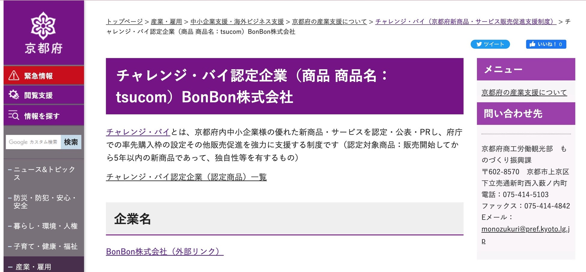 BonBonの動画レビューツール「tsucom」が京都府の助成金「チャレンジ・バイ」対象に認定いただきました