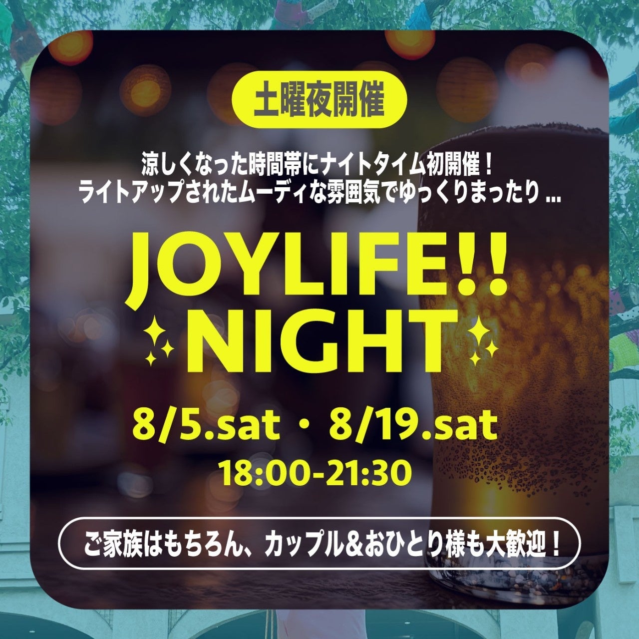 さらに涼しくなる夜の時間帯には、ご家族連れはもちろん、カップルやおひとり様でもお楽しみいただけるナイトタイムも初開催。日常やお店とはまた一味違う、優美な会場の雰囲気を味わいながら、オーガニック料理やアルコールなどもお楽しみいただけます(ミニ花火も販売予定)。