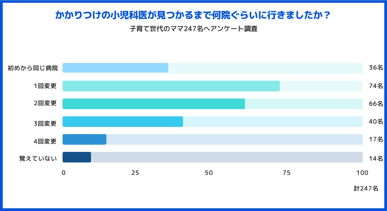 本アンケート調査の結果、かかりつけの小児科が見つかるまでに、「平均1~2回」病院を変えていることが明らかとなりました。