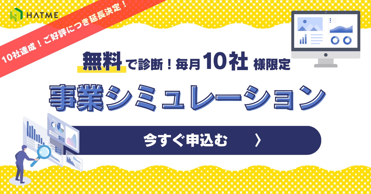 HATME株式会社では、無料診断サービス " 事業シミュレーション " の申込みが10社達成したことを記念して、キャンペーンの延長を決定いたしました。