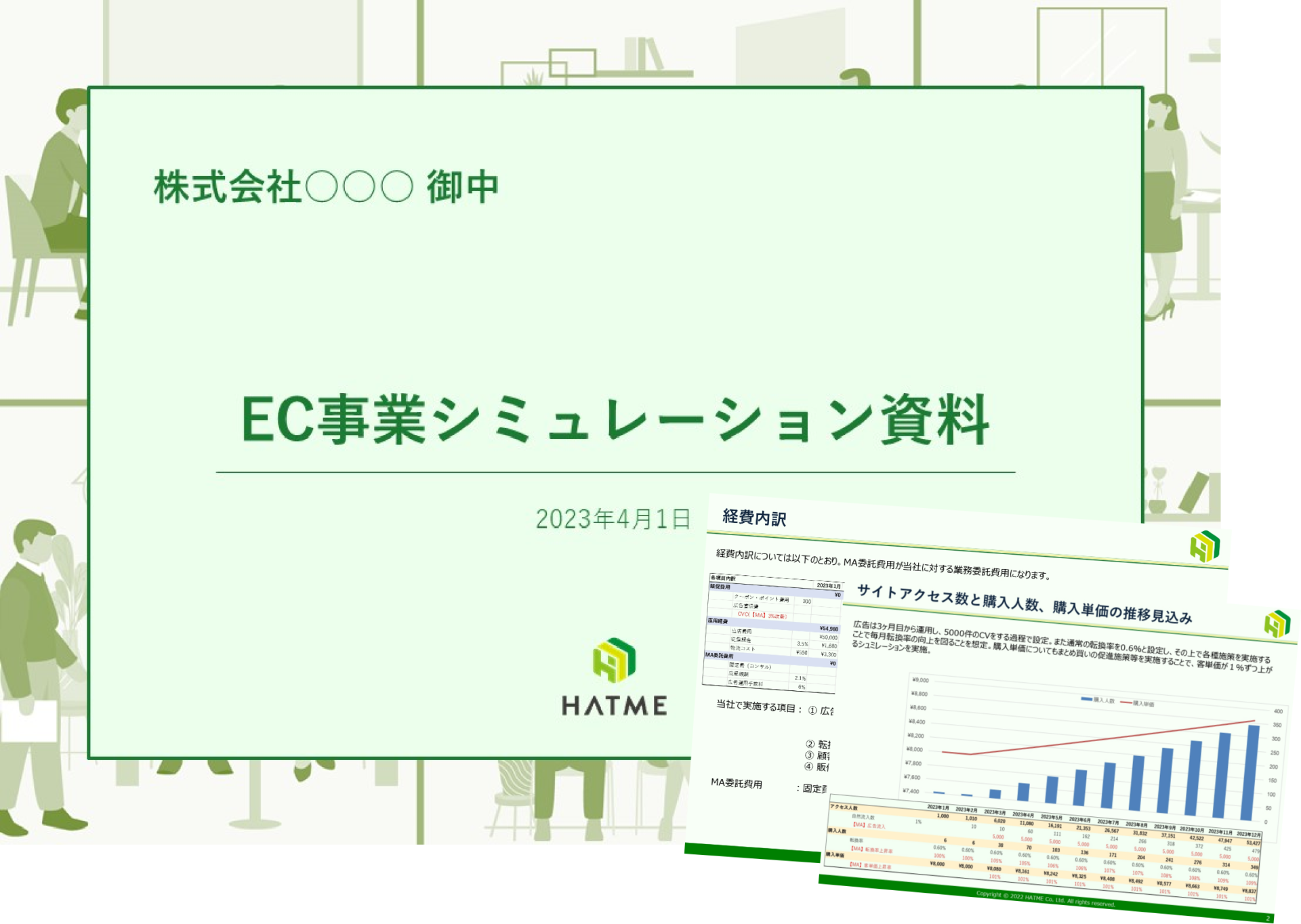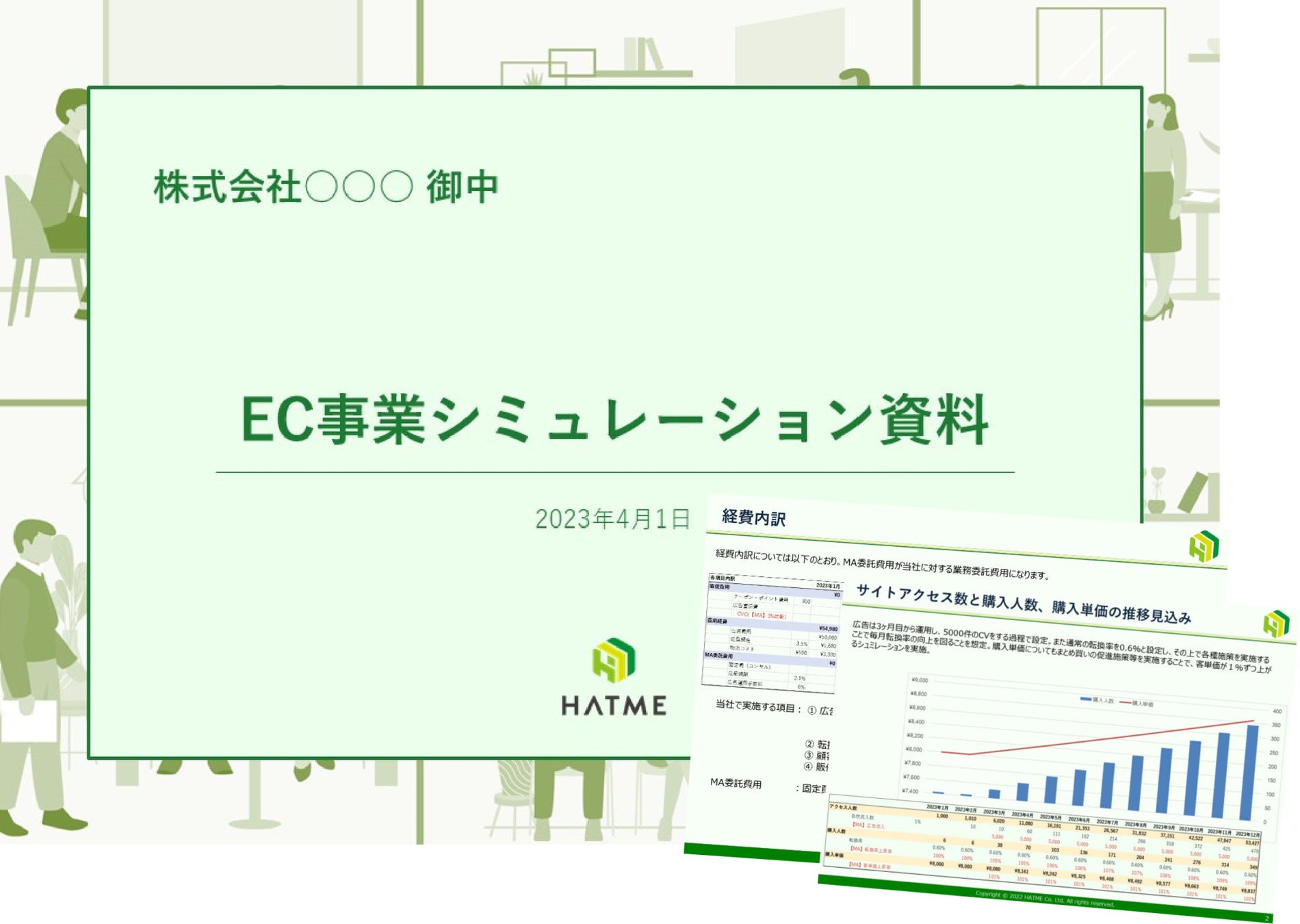 なお、無料事業シミュレーションは、HATMEとマーケティングアソシエーション株式会社(東京本社:東京都台東区、代表取締役:中園 広和)と共同で運用している「なるほど!まかせてEC」にて受け付けていますので、ご興味のある方はご連絡をお待ちしています。