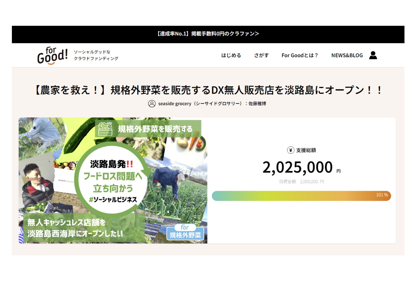 2024年3月16日から4月30日まで実施しておりました、クラウドファンディング【農家を救え!】規格外野菜を販売するDX無人販売店を淡路島にオープン!!が無事終了し、この度多くの方々のご支援の元、200万円という大きな目標金額を達成する事が出来ました。