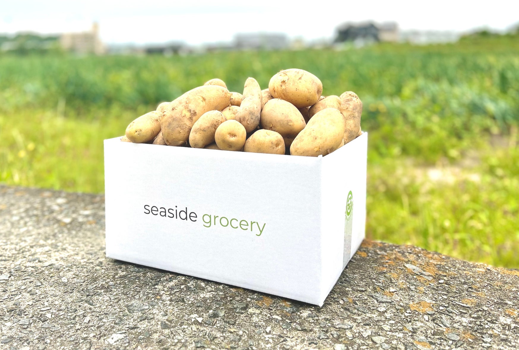 そんなFARM SEASIDE(ファームシーサイド)プロジェクトの収穫第一弾となる、じゃがいもの収穫が始まり、この度淡路島産規格外野菜販売サービスseaside grocery(シーサイドグロサリー)のオンラインページより淡路島産規格外野菜じゃがいもボックスを計3サイズ販売をスタートいたしました。