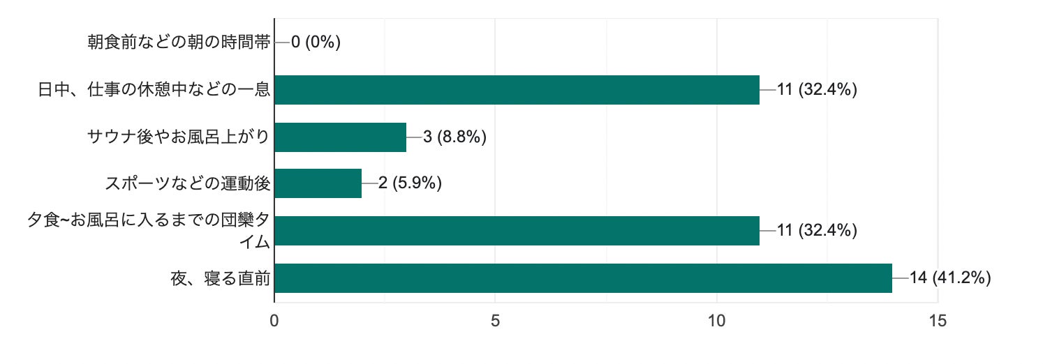 次に、CBD製品の利用者を対象に、どのようなシーンで利用しているか調査した所、「夜、寝る直前」が最多となりました。
