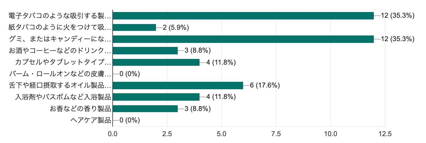 次に、CBD製品を利用したことがある方に対し、「製品別の利用経験(複数回答可)を調査したところ、ベイプとグミが最も多い結果となりました。