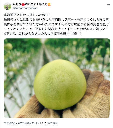 特に印象的だったのは、「かおり🍅おいでよ!平取町🙋」(ユーザー名:@tomatofarmerkaoによる継続的な投稿です。