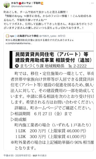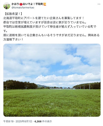 地域の住宅不足を伝える投稿から、町外の事業者がアパート建設に手を挙げる