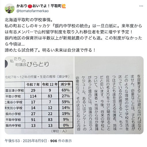 その中で紹介された、「来年度より山村留学制度を導入予定」との発言に対し、九州在住の親子から“平取町に移住・留学したい”という連絡が届くなど、発信がきっかけで人が動く現象が起きています。