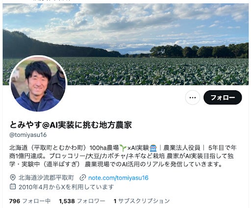 「とみやす@AI実装に挑む地方農家」(ユーザー名:@tomiyasu16)