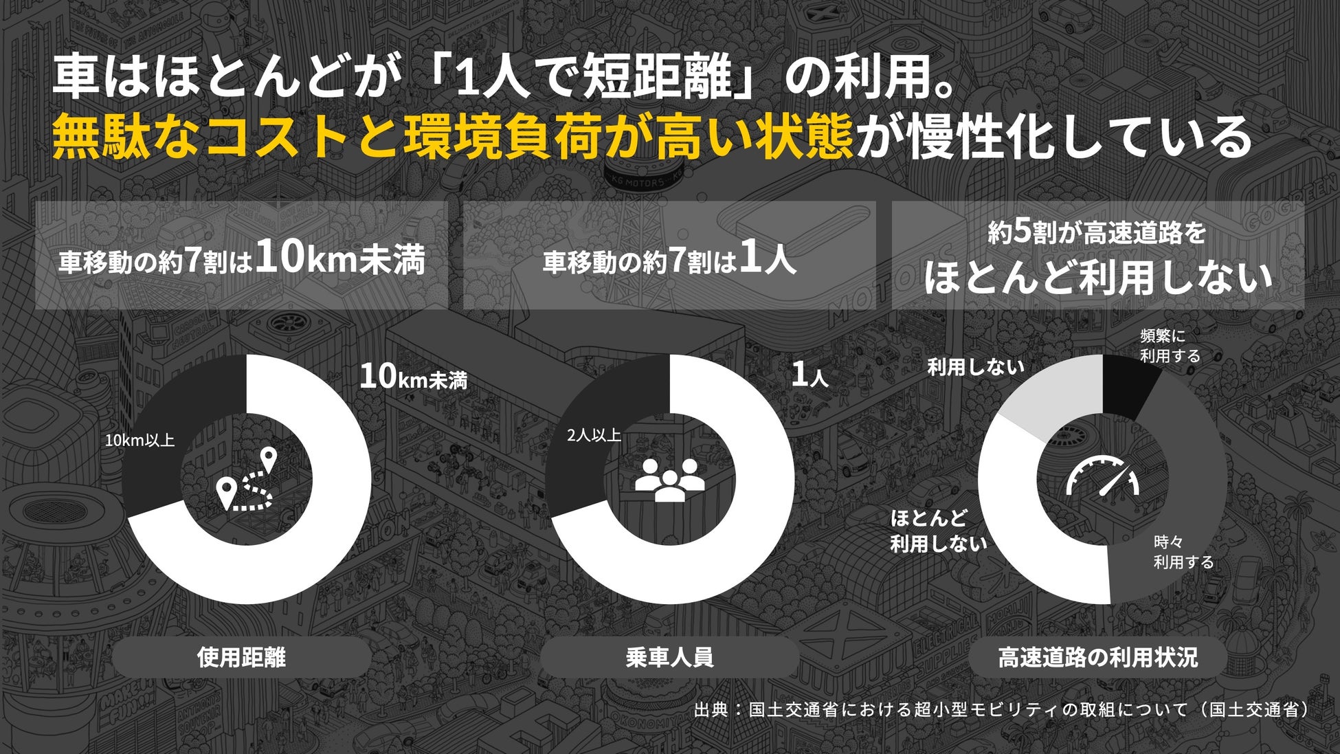 一方で、車の利用実態を見ると、ほとんどが1人での短距離移動に限られており、軽自動車ですら日常利用においてはオーバースペックで、無駄なコストと環境負荷が高い状態が慢性化しています。