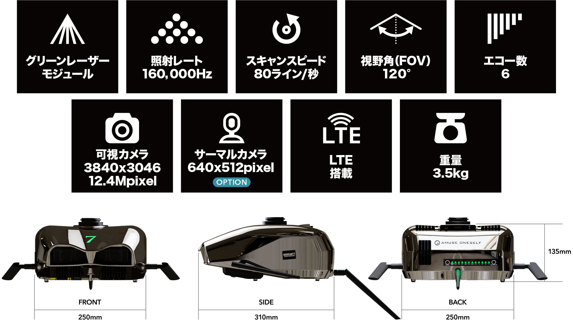 他のドローン用グリーンレーザーシステムは水部のみをターゲットとしていますが、私たちの製品は水陸両用のグリーンレーザーシステムとなっています。