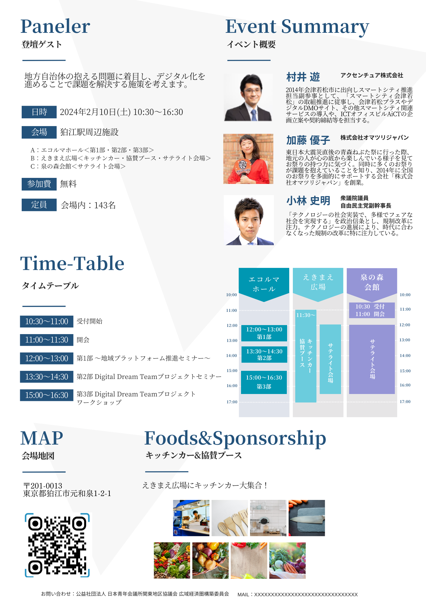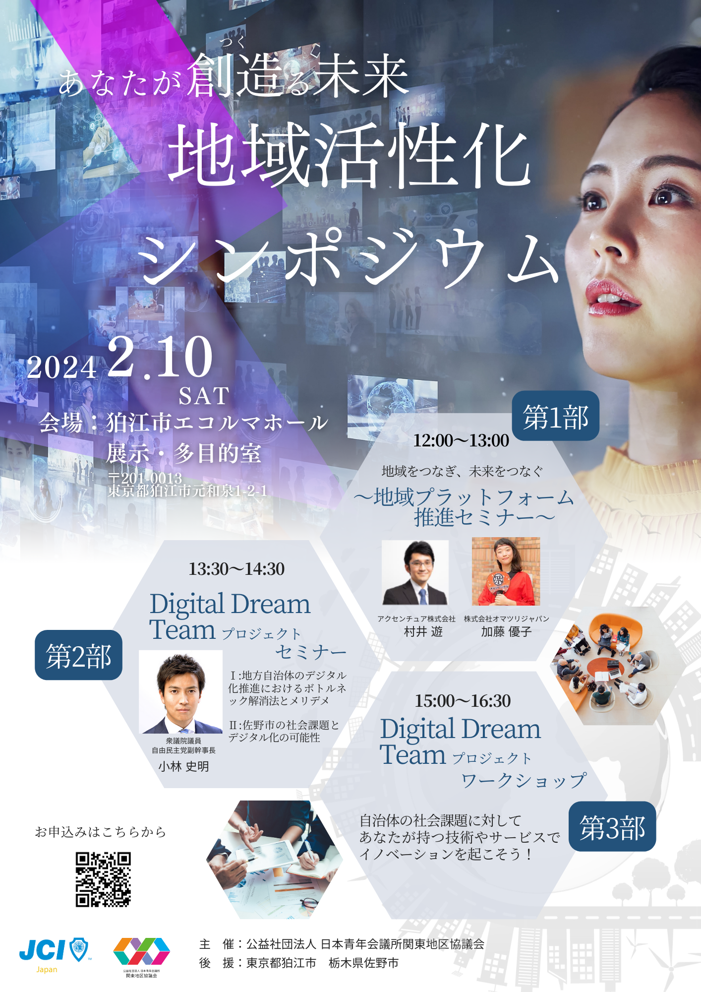 公益社団法人日本青年会議所関東地区協議会(事務局:東京都千代田区、会長:山本 健太)は、2023年2月10日(土)に東京都狛江市エコルマホールにて「あなたが創造る未来~地域活性化シンポジウム〜」を開催いたします。ゲストに株式会社オマツリジャパン 代表取締役 加藤 優子氏、アクセンチュア株式会社 ビジネスコンサルティング本部 公共サービス部門 マネージャー 村井 遊氏、自由民主党新しい資本主義実行本部事務局長 小林 史明氏を迎え、地域プラットフォームや地方自治体のデジタル化の可能性について語っていただきます。また、セミナーを踏まえて参加者の持つサービスや技術が自治体にどう活かせるかを考えるワークショップを開催いたします。参加費無料、当日の参加も可能です。