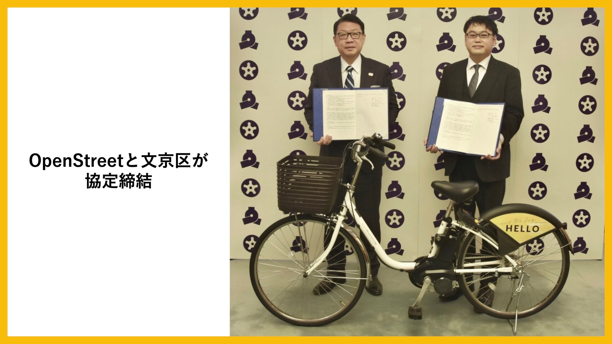 OpenStreet株式会社(本社:東京都港区、代表取締役社長 CEO:工藤 智彰、以下「OpenStreet」)は文京区と協定を締結し、2023年5月(予定)より順次「HELLO CYCLING」のシェアサイクルステーションを同区内の公有地に設置していくことをお知らせします。