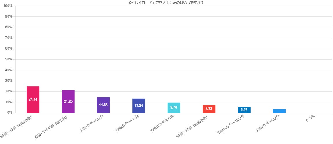 ハイローチェアを入手したタイミングは、「妊娠28週~40週の妊娠後期」が24.7%と最も高く、次いで「生後1ヶ月未満」が21.2%でした。