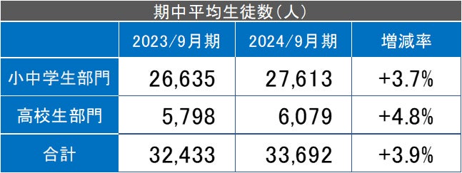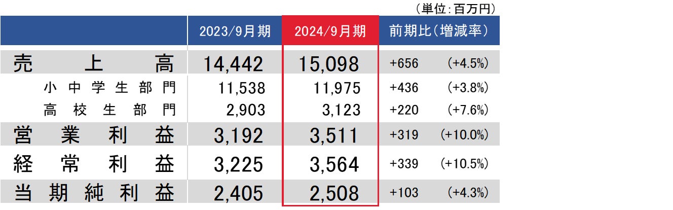 生徒数が当初見込みよりも順調に伸び、期中平均で3.9%の増加となった結果、売上高は過去最高を更新する15,098百万円(前年同期比4.5%増)となりました。