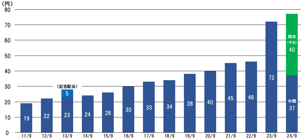 当社は配当性向50%を目安としております。直近の業績動向を鑑み、期末配当を直近の配当予想から3円増配し、1株当たり40円とすることといたしました(2024年12月14日開催予定の第46回定時株主総会に付議する予定)。