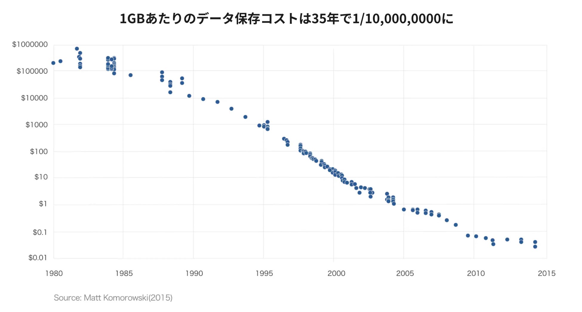 数十年前はたった1MBしか容量のないSDカードが何万円もしたように、データ保存にかかるコストは時間が経つにつれて劇的に安くなっています。