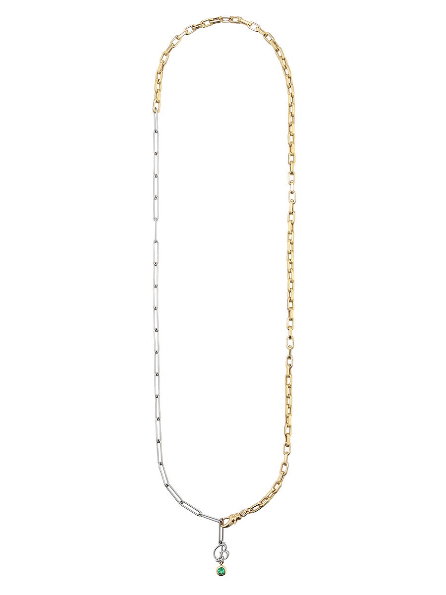 K18イエローゴールドとプラチナといった異なる素材のチェーンを繋ぎ合わせた【デュオチェーン】のネックレスとブレスレットには、MADISONBLUEのシグネチャー"Bマーク”と瑞々しいエメラルドをあしらい、印象的な存在感を放ちます。