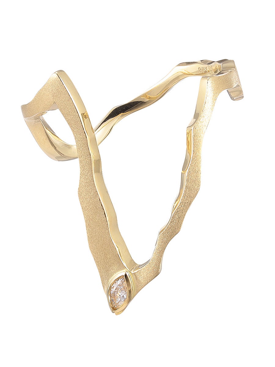 着用者の指がまるで金継ぎされているかのような、躍動感のあるV字ラインが美しい【KINTSUGI】リングは全3型。リングの表面にオリジナルと反転させたマットゴールドを使用し、カジュアル感を演出。素材感を生かしたシンプルなリングだけでなく、V字の先端にマーキスダイヤモンドをあしらったり、パヴェダイヤモンドをVライン沿いに配すなど、華やかでエレガントなデザインも。