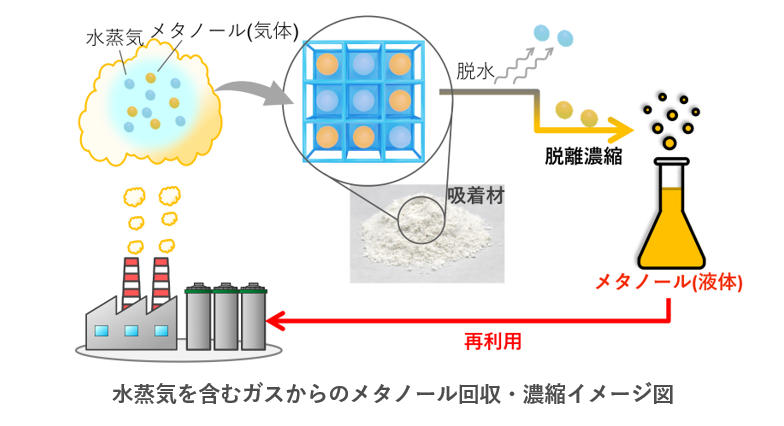 開発したメタノール吸着材は、水が存在していても、メタノールを吸着して高濃度に回収できます。メタノールを含む廃ガス・廃水を処理している化学工場やパルプ工場、製紙工場などから、資源としてメタノールを回収することが期待できます。