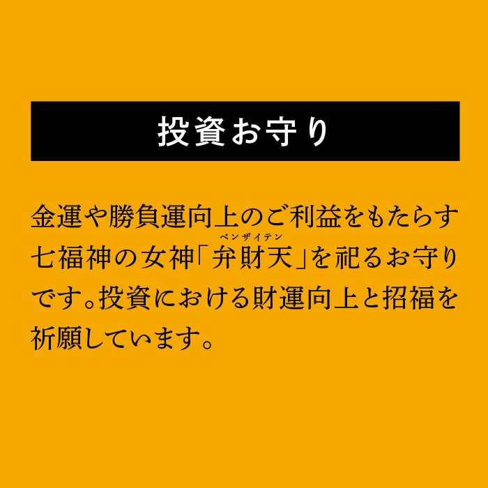 金運や勝負運向上のご利益をもたらす七福神の女神「弁財天」(ベンザイテン)を祀るお守りです。投資における財運向上と招福を祈願しています。株投資はもちろん、投資信託、金銀プラチナ、FX、国債、不動産などさまざまな投資商品へのご利益を願っています。