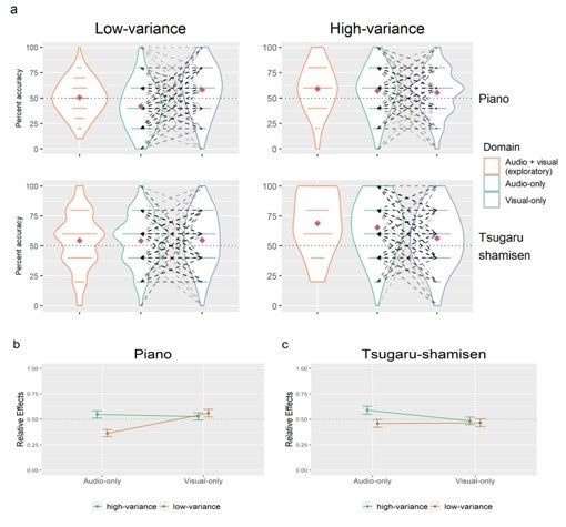 本研究チームは、音楽演奏の評価はどの感覚に依存しているのかを研究するため、クラシックピアノ・津軽三味線コンクールから演奏者間の質(1位と2位、1位と下位)と動画の視聴条件(映像のみと音声のみ)を制御した実験デザインを組み立て、155名の日本人参加者に優勝者を判断してもらう実験をオンラインで行いました。実験の結果、相対的な演奏者間の質と視覚/聴覚の刺激に交互作用が確認され、この交互作用は文化横断的に一般的であることが明らかになりました。一方で、クラシックピアノにおいて上位間の演奏者を評価する場合は視覚による判断が優位であり、津軽三味線において上位と下位の演奏者を評価する場合は聴覚による判断が優位であることが示され、音楽演奏の判断における視覚と聴覚のバランスに文化的な要因があることも発見しました。