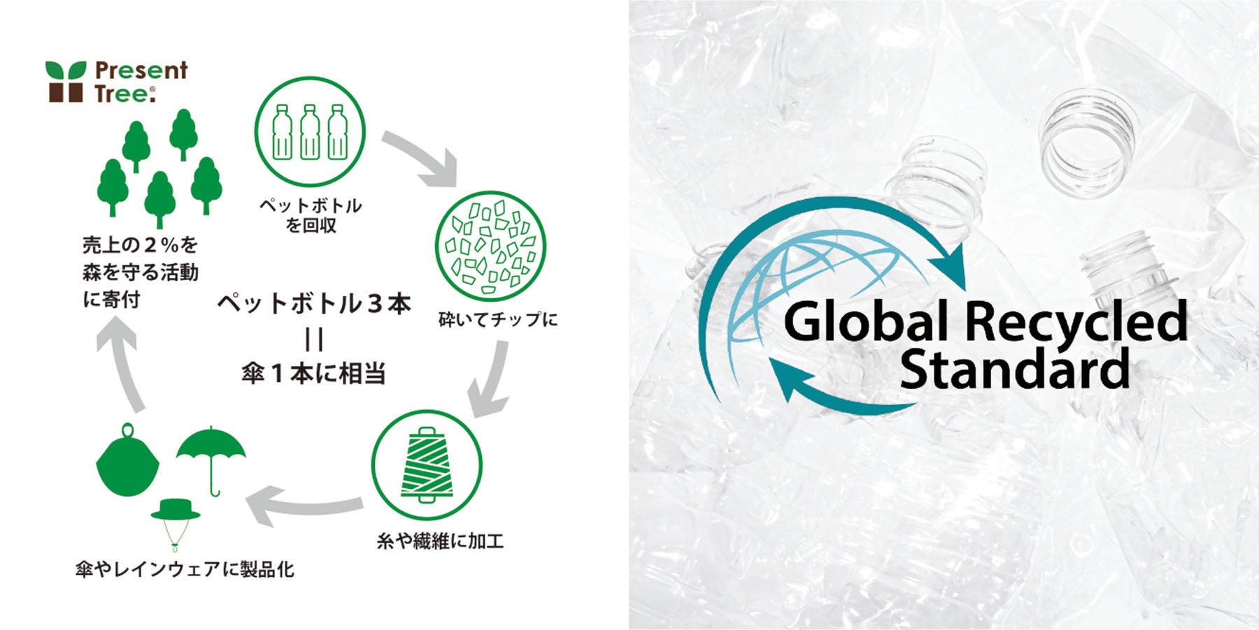 傘やレインウェアで使用している生地は、*グローバル・リサイクルド・スタンダード (GRS) 認証の100%リサイクル原料から作られた繊維。(*GRS は、リサイクル含有物、加工流通過程管理、社会および環境慣行、および化学規制の第三者認証の要件を設定する、国際的で自発的な完全製品基準です。 )