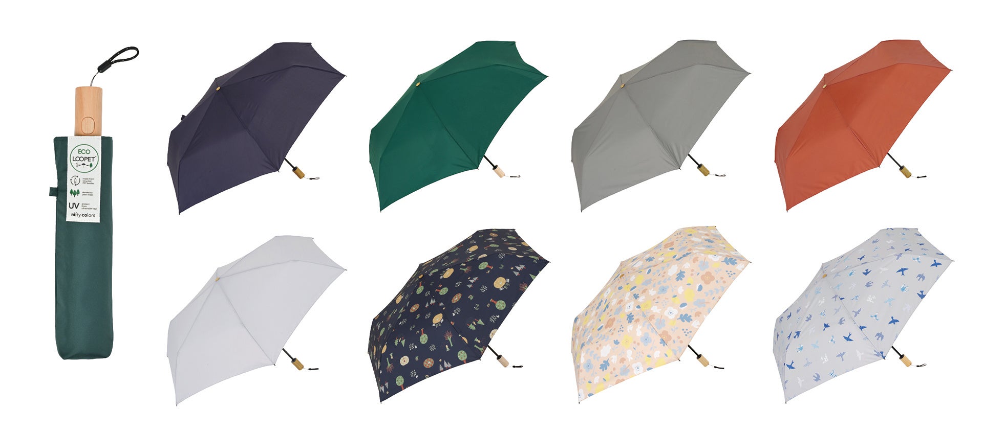 ニフティカラーズ(nifty colors)は、ペットボトル再生繊維を使用したサステナブルブランド「ECOLOOPET(エコルーペット)」を2023年春よりスタートさせました。「リサイクル」と「チャリティ」をテーマに、傘やレイングッズの生地に100%リサイクル原料の生地を使用し、その売り上げの一部(2%)を森林再生プロジェクト「Present Tree」に寄付することで環境保全に貢献していきます。