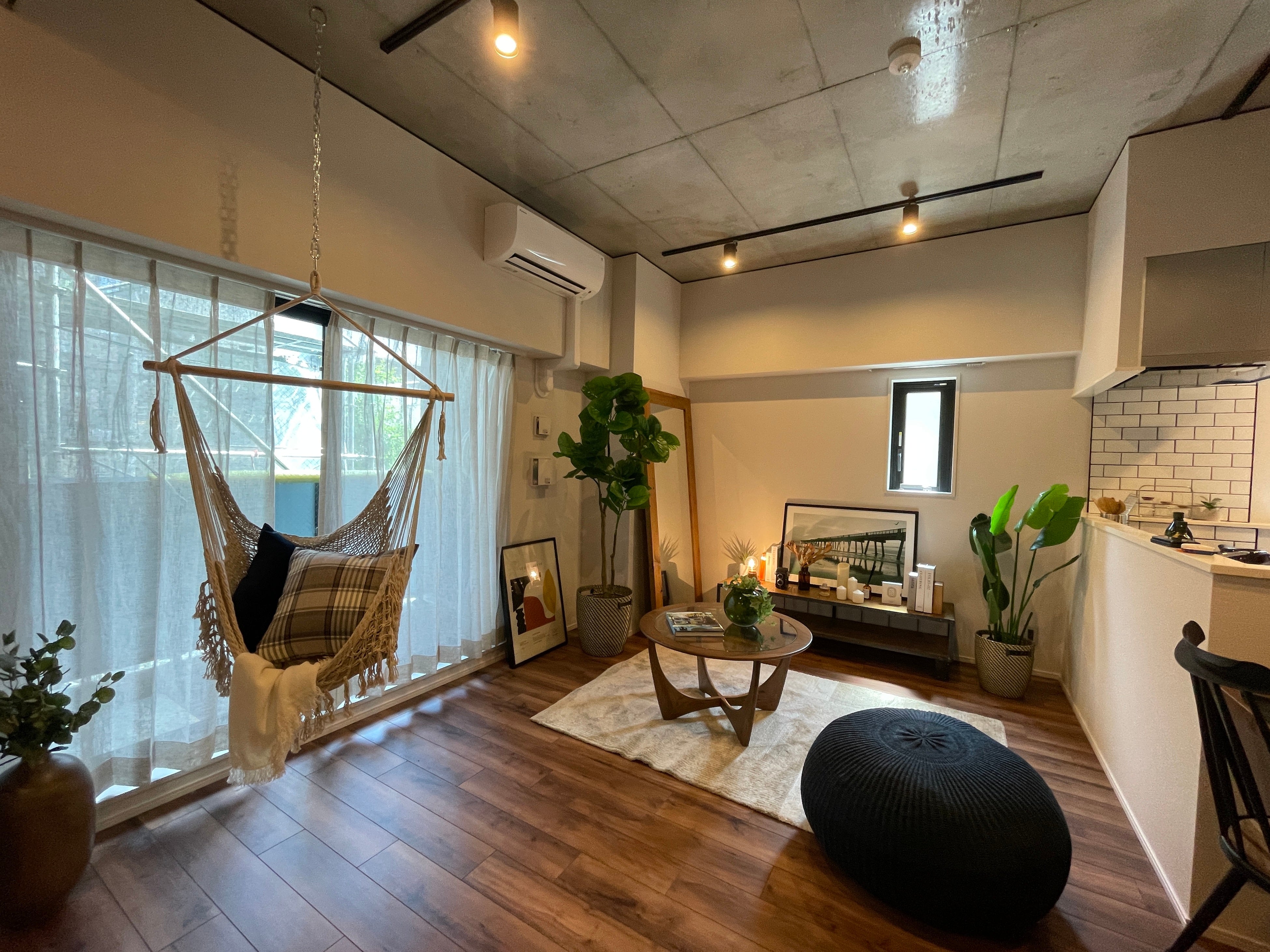 LDK の天井にあるアンカーボルトに、ハンモックやハンギンググリーンなどを吊り下げることができます。