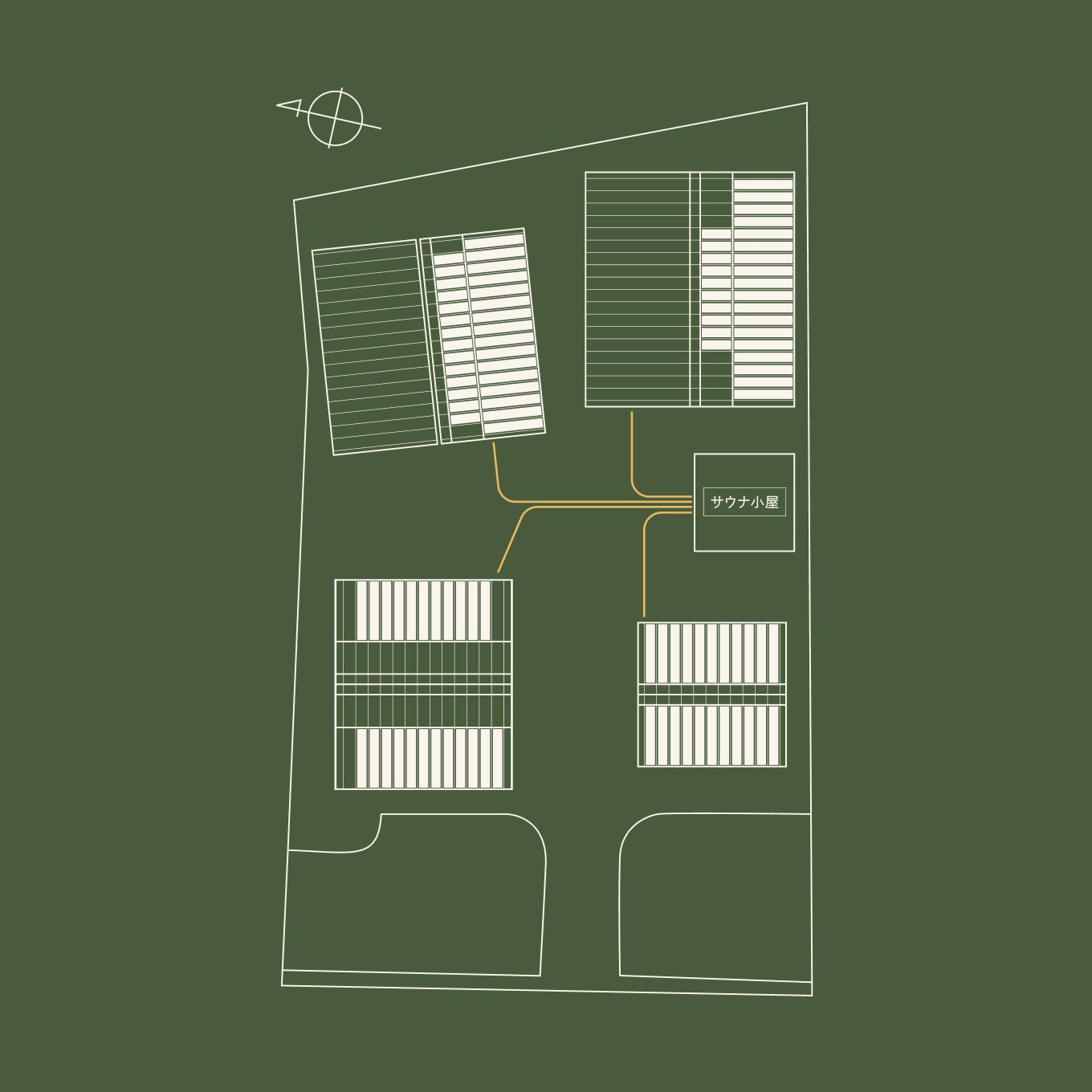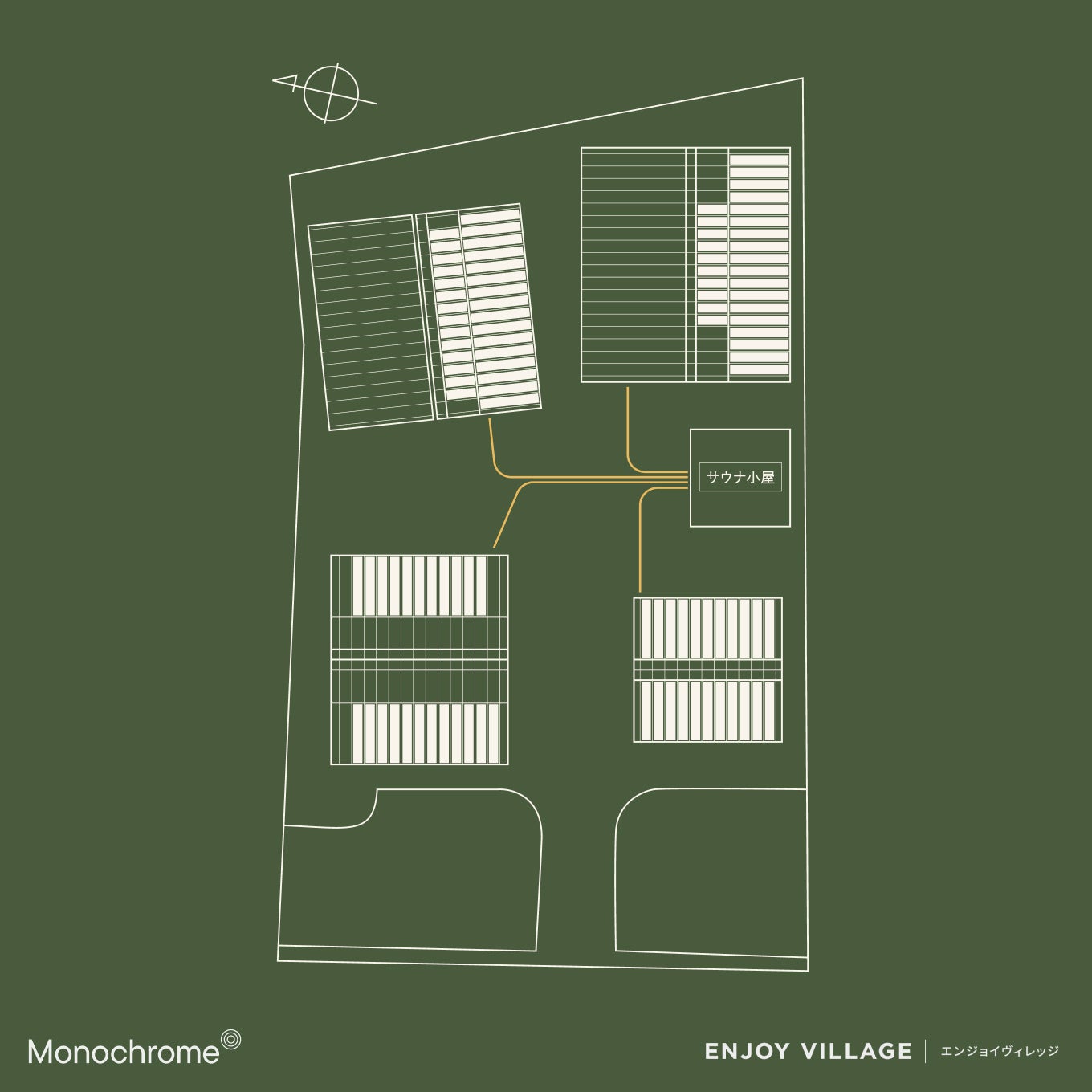 秋谷ビーチまで徒歩10分、前田橋遊歩道まで徒歩6分の場所に位置する当ヴィレッジは4棟のスケルトンハウスとサウナ小屋から構成されます。