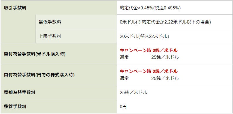 内容:米ドル買い時に発生する為替手数料(1米ドルあたり25銭)が無料となります。また、円貨決済での米国株買付時の為替手数料も無料となります。
