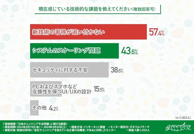 また、「現在感じている技術的な課題を教えてください(複数回答可)」と質問したところ、『新技術の習得が追い付かない(57.4%)』と回答した方が最も多く、次いで『システムのスケーリング問題(43.6%)』と続きました。