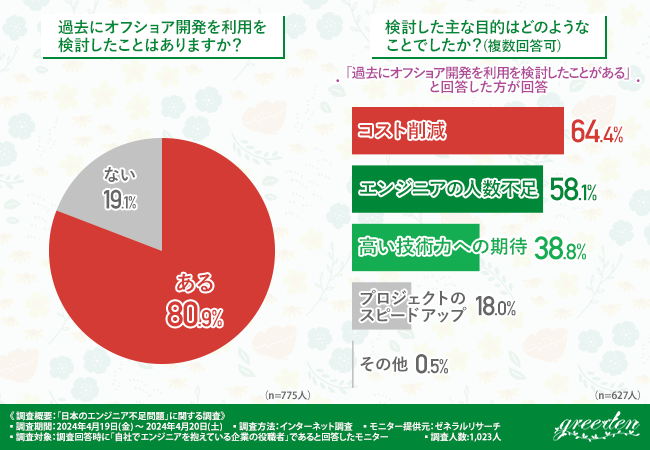 また、「検討した主な目的はどのようなことでしたか?(複数回答可)」と質問したところ、『コスト削減(64.4%)』と回答した方が最も多く、次いで『エンジニアの人数不足(58.1%)』『高い技術力への期待(38.8%)』と続きました。