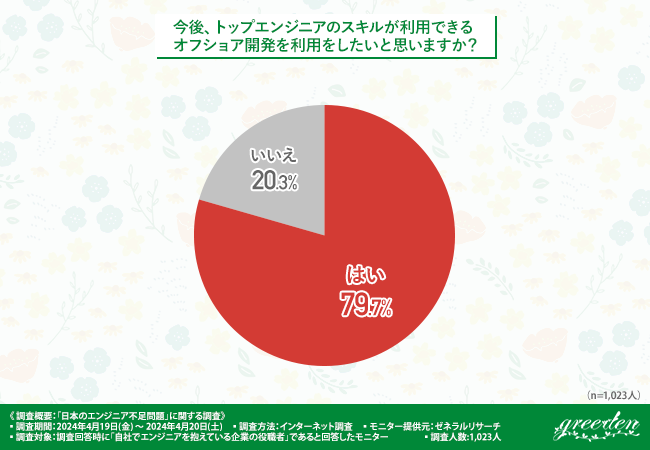 最後に、「今後、トップエンジニアのスキルが利用できるオフショア開発を利用したいと思いますか?」と質問したところ、約8割の方が『はい(79.7%)』と回答しました。