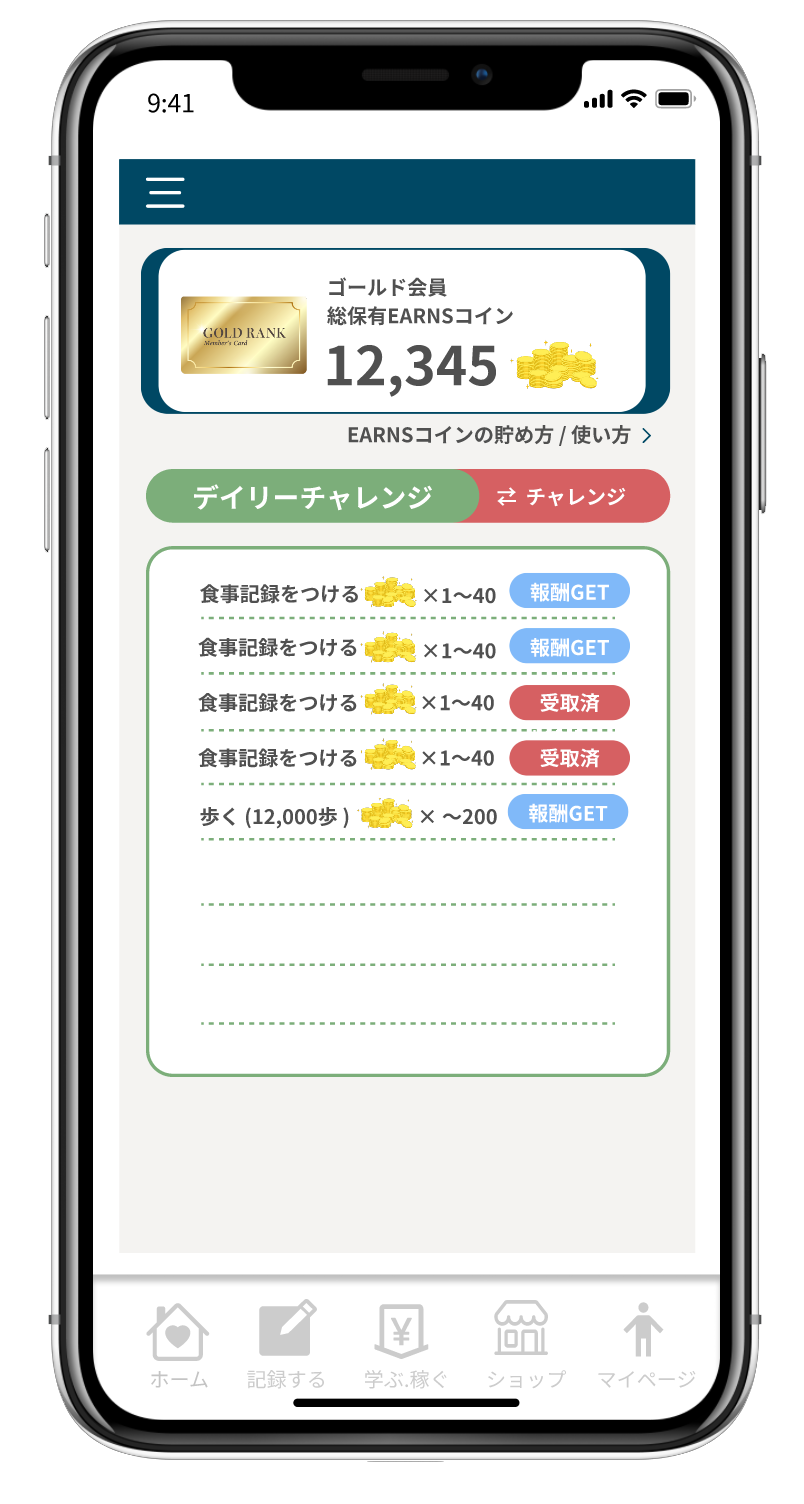 ヘルスレベル診断を搭載している健康習慣を維持するためのチャレンジ機能、毎日の健康習慣を記録するデイリーチャレンジの2種類よりコインを獲得することが可能です。