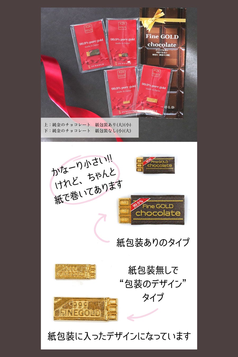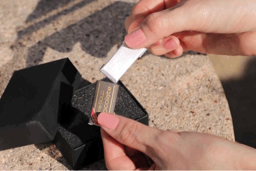 純金のチョコレートは、純金の持つ「資産価値」や「黄金色の美しさ」を楽しむ「遊び心」満載の商品です。