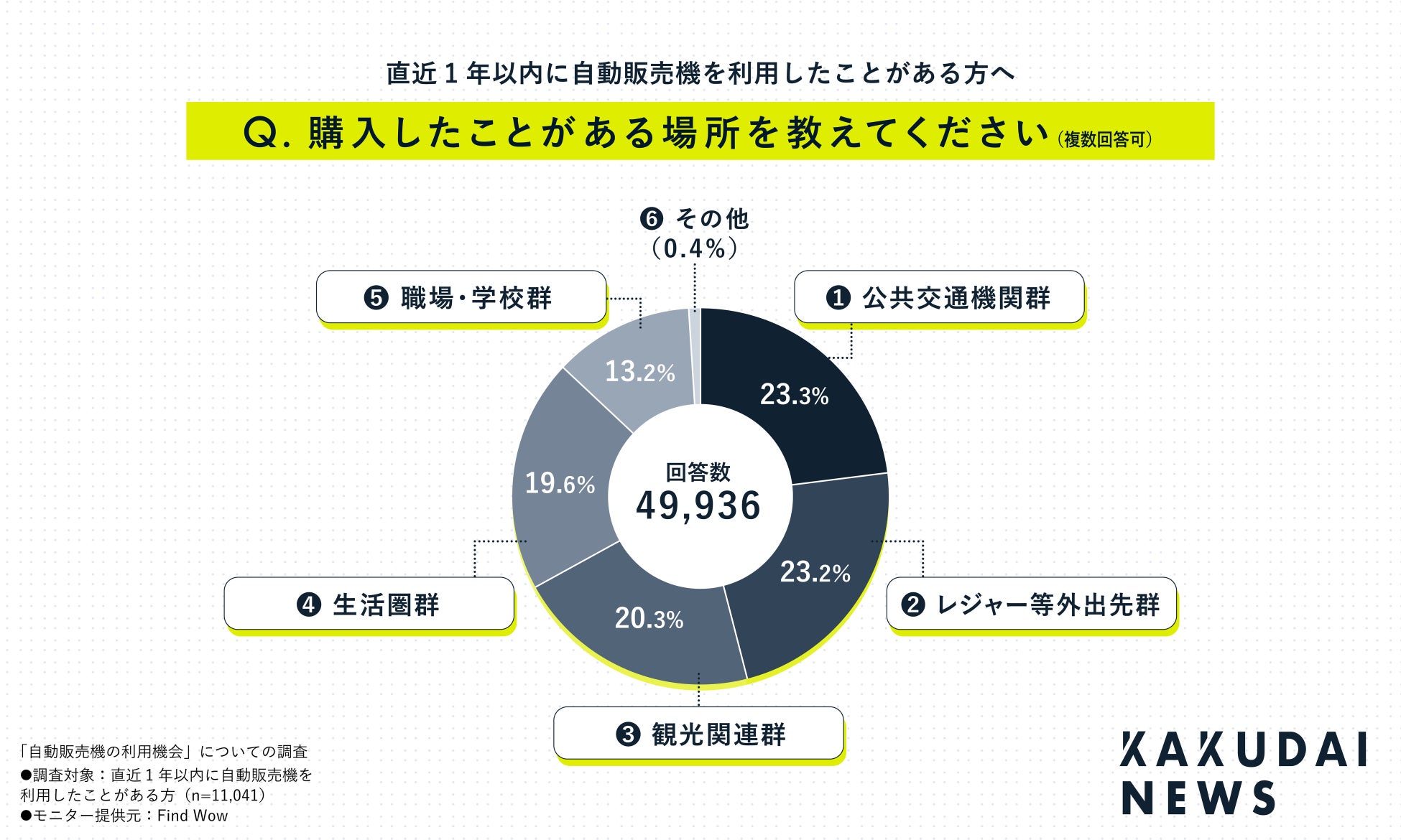 「自動販売機で購入をしたことがある場所を教えてください」と聞いたところ、ロケーション別では、『公共交通機関(23.3%)』『レジャー・商業施設(23.2%)』『観光地・宿泊施設(20.3%)』という結果になりました。