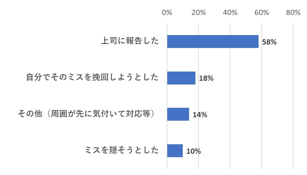 「大きなミス・大失敗をした際に、まず取った行動はなんですか?」という質問に対して、最も多かった回答は「上司への報告」の58%でした。