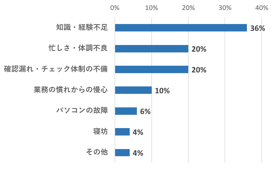 次いで多かったのが、「忙しさ・体調不良」と「確認漏れ・チェック体制の不備」のそれぞれ20%です。