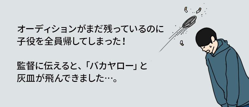 映像制作会社に入社し、配属されて初めて仕事に従事した20代前半。 一つ上の先輩から、子役をオーディション控え室から、オーディション会場まで連れて行く仕事を託されました。 オーディションが終わるたび、また次の子を連れて行き、入れ替えに、終わった子を控え室の保護者のもとに連れて戻るという風に、オーディション控え室から会場を何度も往復していました。 そのときの監督は、オーディションにだいぶ長い時間をかける人だったんですね。 オーディションが終わってもまだ子どもと控え室に待たされていた母親は、待ち時間に痺れを切らし、すごい剣幕で私に対して、「もう帰っていいか?」と怒って尋ねてきたんです。 そこで私はすっかり委縮してしまって、「あ、たぶん大丈夫だと思います」と言ってしまいました。 オーディションが最後まで終わった時には、控え室には既に誰も居なくなりました。 私は「お疲れ様でした」を言いに、オーディション会場に戻りました。 すると監督が「じゃあ、子どもたち、違う組み合わせで見ていこうか」と言ってきたのです。 そのとき、控え室にはもう誰も残っていないと知っているのは、私だけでした。 冷や汗が、全身から流れ出しました。 正直に伝えたところ、「バカヤロー!!!!!」の怒声と灰皿が飛んできてきました。 (ひっきさん 映画製作AD 男性 50代 東京都在住) エピソードの続き:https://studio-tale.co.jp/career-stories/guide/a-failure-at-work/#episode3 |